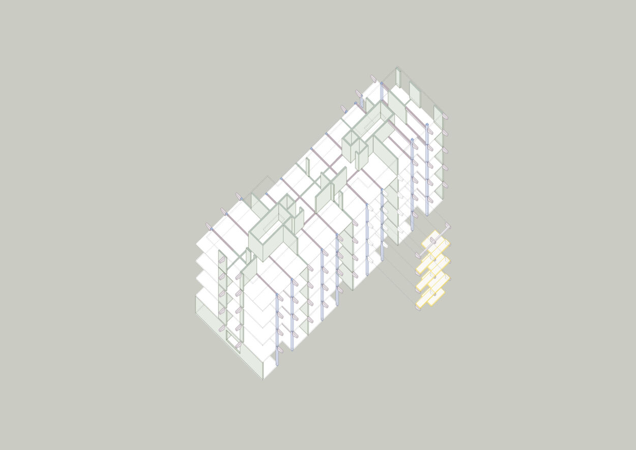 Während sich die Eingriffe in den Bestand in den unteren Geschossen auf ein Minimum beschränken, nehmen die Massnahmen nach oben hin zu. Ziel ist es, sämtliche Interventionen so präzise wie möglich zu gestalten und einen respektvollen, aber zukunftsfähigen Umgang mit der historischen Bausubstanz zu finden.