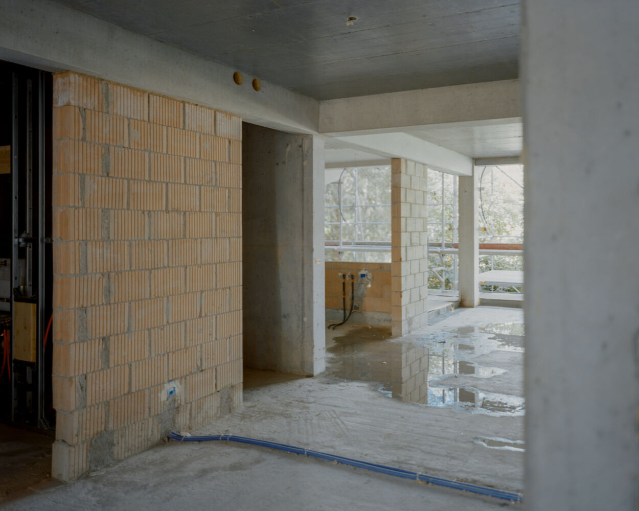 Der Erschliessungskern wird raumhaltig erweitert. Dies zum einen in Form von unmittelbar anschliessenden Nebenräumen oder – im Falle der Wohnung – mittels freistehender Nasszellen, welche über eine aufgebaute Topografie aus Acrylstein mit dem Kern im Zentrum verbunden sind. Raumhohe, 180° öffenbare Pendel- und Schiebetüren ermöglichen verschiedene Raumkonfiguarationen, um den unterschiedlichen Bedürfnissen des Alltags gerecht zu werden. So lassen sich zum Beispiel die zur Fassade hin offenen Nebenräume zu kompakten Kammern verschliessen, die den freien Grundriss zonieren. Entlang der Fassade und des Kerns entsteht ein fliessender Raum, der die Charakteristik des «plan libre» in seiner Grosszügigkeit weiterhin räumlich erlebbar macht.
