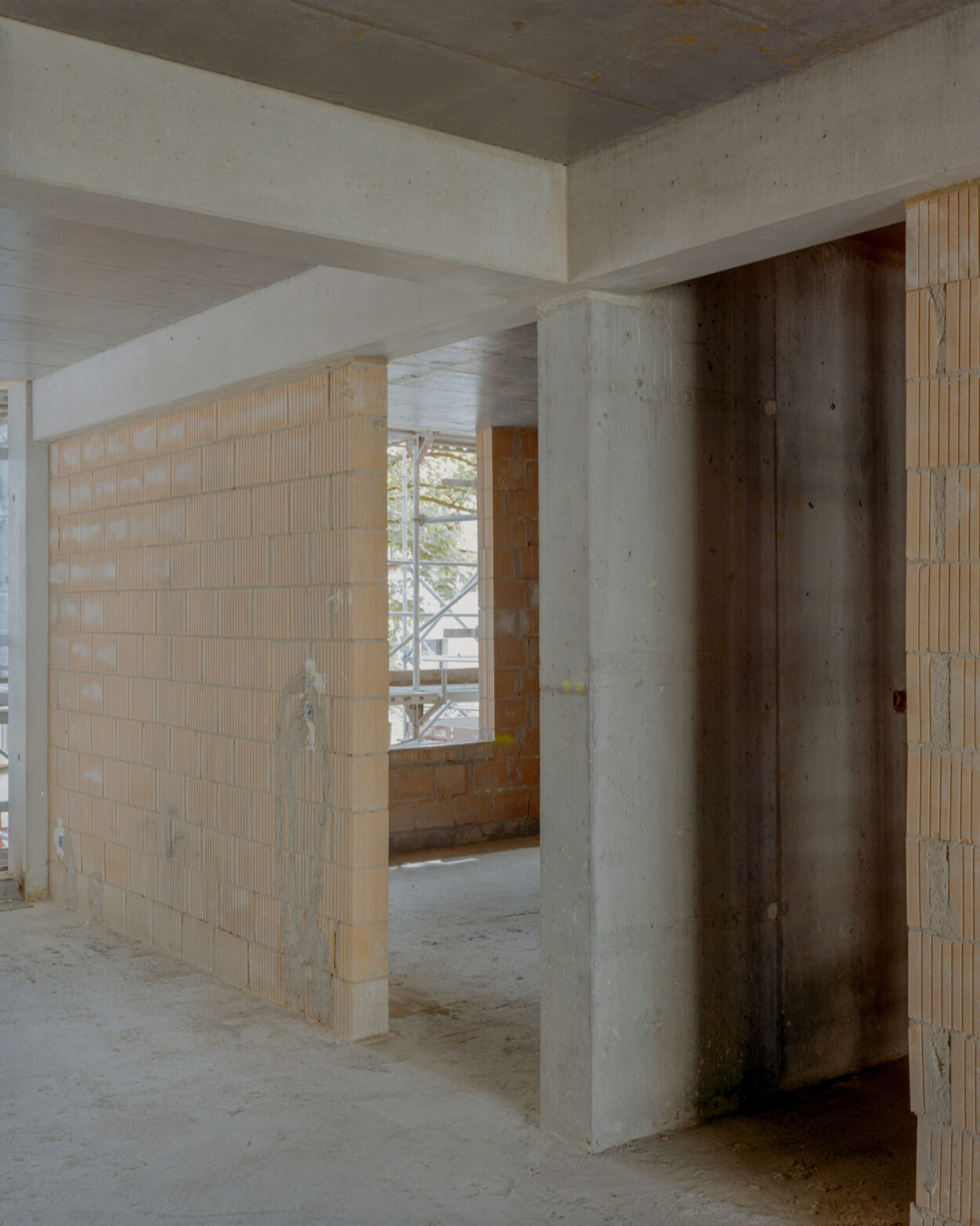 Die Stofflichkeit des Doppelschalenmauerwerks aus Kalksandstein und Normalbackstein soll nicht nur nach aussen hin zeichnen sondern gleichermassen im Innenraum spürbar bleiben. So werden die Normalbacksteinwände lediglich weiss gestrichen und wo sich das Tragwerk auf Stützen reduziert werden die Steine sogar ganz roh belassen. In ebenso direktem Umgang mit den Materialeigenheiten von Zement, werden die Betondecken, -wandscheiben und der Anhydritboden sichtbar belassen. Die Schreinerarbeiten aus Kirschbaumholz sorgen mit ihrer Naturbelassenheit für eine warme Atmosphäre.