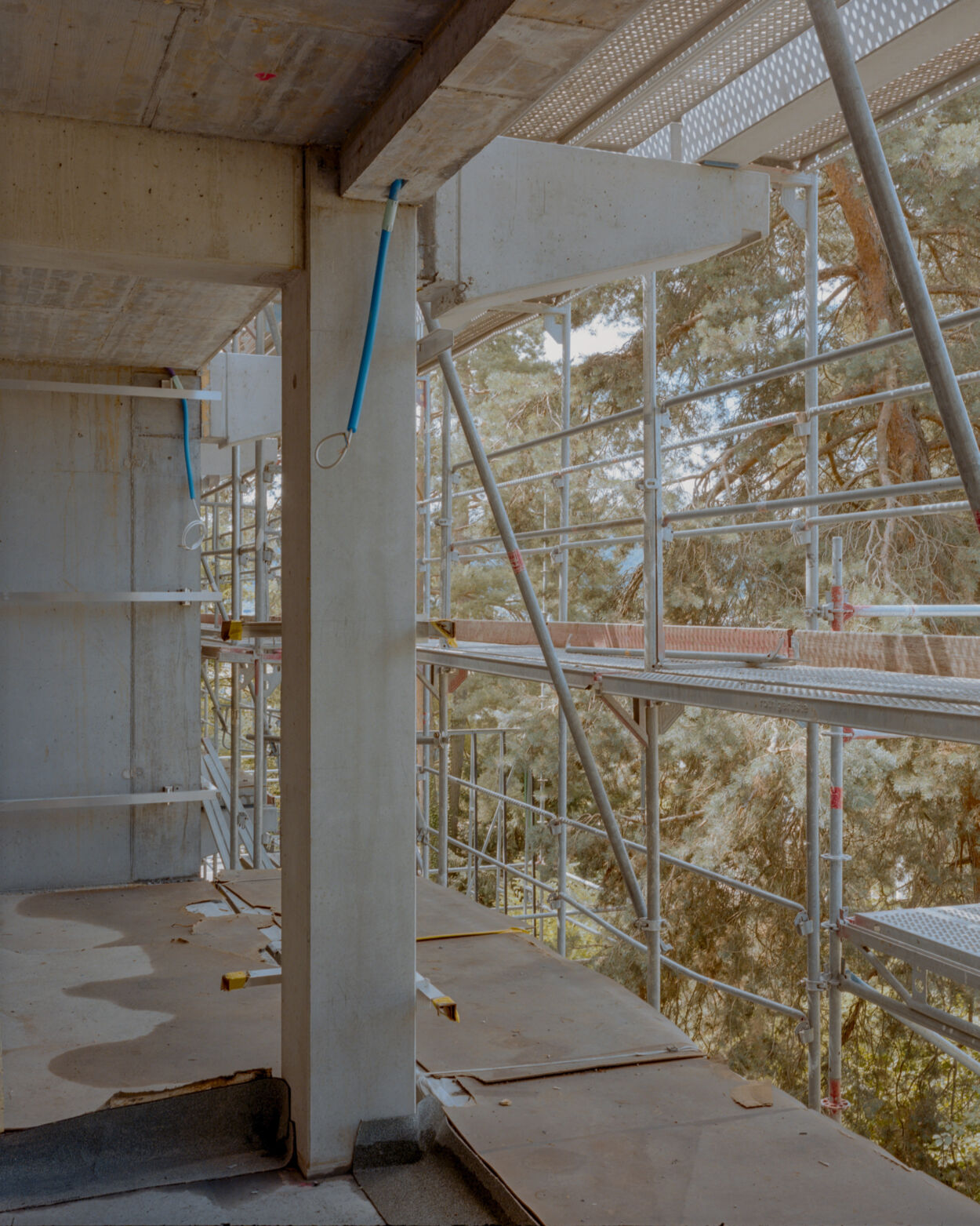 Im Sinne des Tragwerkskonzepts des Bestands, mit seiner lastableitenden Betonfertigelement Fassade, dem tragenden Kern und den dazwischen freispannenden Geschossdecken, folgt der vertikale Lastabtrag der Aufstockung dem selben statischen Prinzip. Der Erweiterungsbau in Stahl-Holz-Verbundbauweise überspannt unter Einschluss der Pergolastruktur den gesamten Grundriss und garantiert so, dass nur geringe Lasten auf die bestehende Geschossdecke abgegeben werden. Der im Aussenraum liegende Teil des Tragwerks wird über Kragplattenelemente kraftschlüssig mit der innen liegenden Struktur verbunden und bauphysikalisch entkoppelt.