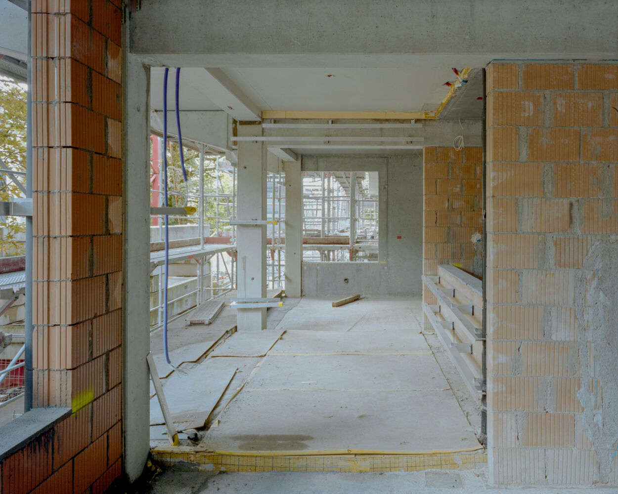 Ebenso wie der Ausbau des Kindergartens orientiert sich der aufgrund einer veränderten Marktsituation nachträglich ausgeführte Wohnungsausbau im Attikageschoss an den Prinzipien des Bestands.