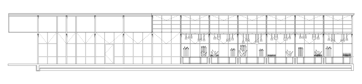 Der archaische, gläserne Gewächshausbau ist inmitten des Grünkorridors platziert und wird dank seiner Durchlässigkeit selber Teil des Landschaftsraums. Durch die Verglasung entsteht auf der Fassadenebene ein Spiel zwischen Transparenz und Spiegelung. Der innere Korridor des Stahlbaus mit den identitätsstiftenden Knotenblechen dient als attraktiver Bewegungs- und Begegnungsraum. Der starke optische Bezug vom Korridor zum Aussenbereich soll das wissenschaftliche Arbeiten gegen aussen hin sichtbar machen und den interdisziplinären Austausch auf dem Campus fördern.