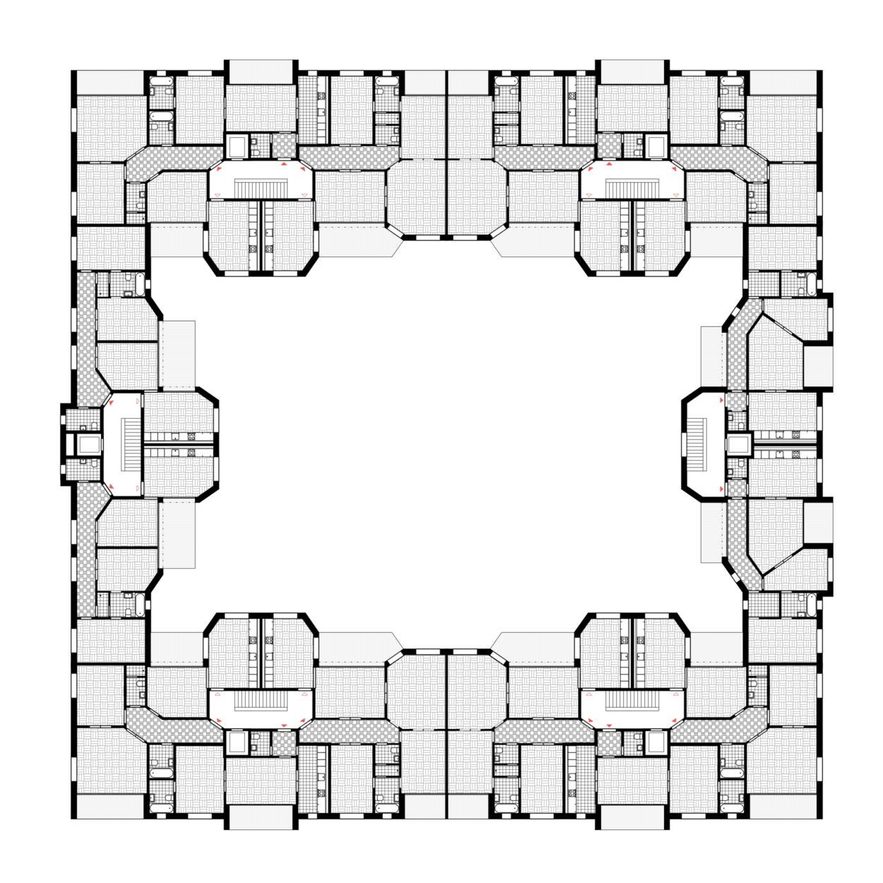 Die Anpassung der Grundrisse in den oberen Geschossen erfolgt sowohl zur Erhöhung der Wohnungsvielfalt, als auch zur Optimierung der Wohnungen hinsichtlich Nutzbarkeit, Belichtung und Lärmschutz. So ermöglicht die geplante Anordnung der Nasszellen, weg von der Fassade und neu im Inneren des Grundrisses, eine optimale Nutzung der vorhandenen Fenster für Wohn- und Schlafräume und sorgt damit für eine gute Belichtung in einem dicht bebauten städtischen Umfeld. Ausserdem wird mit dem Umbau, der im Rahmen der Gebäudeaufnahmen festgestellte suboptimale Zustand des Tragwerks behoben.
