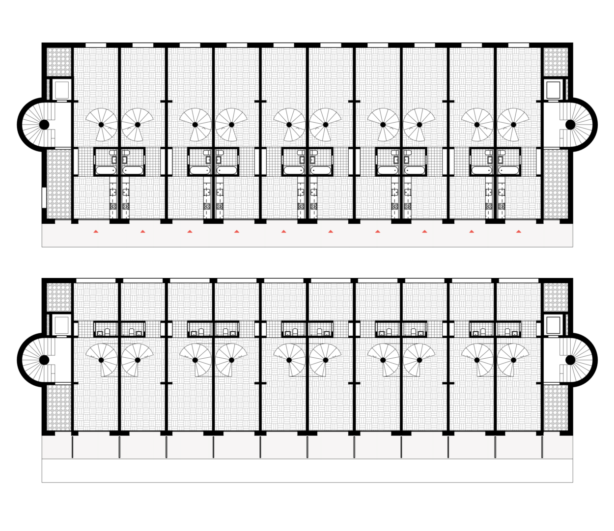 Für «Dianas» und «Hänsels» Erdgeschossflächen wird eine Nutzung durch Wohnateliers vorgeschlagen. Über den rückwärtigen jeweils zum Hof orientierten Vorgarten und den Einbau von Schlafgalerien wird die für eine Wohnnutzung nötige Privatsphäre geschaffen. Nach aussen hin wird gearbeitet. Die Adressierung der kleinteiligen Einheiten erfolgt direkt über den Strassenraum.